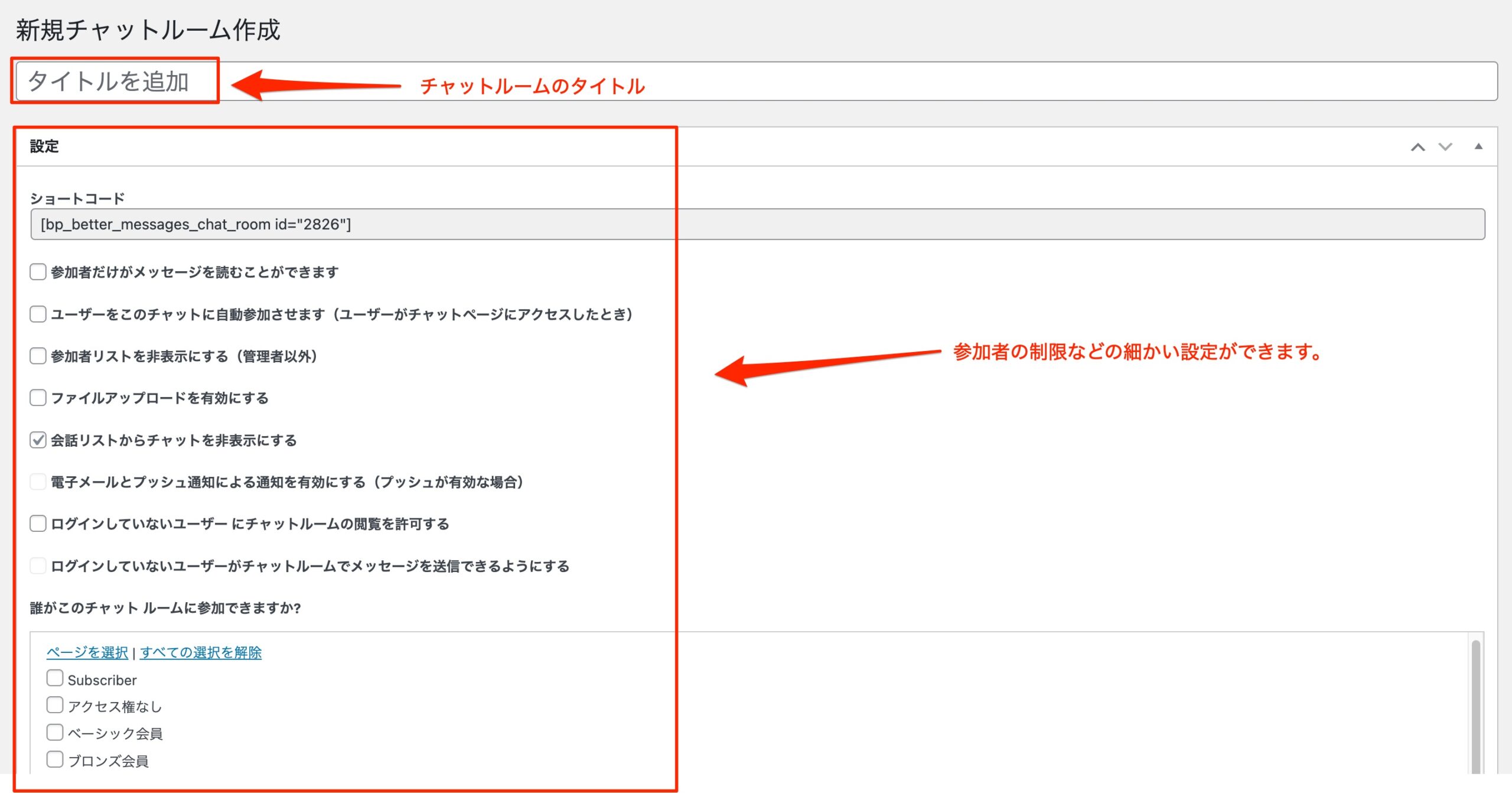 チャットのタイトルを入力し、参加者の権限などチャットルームの設定をします。