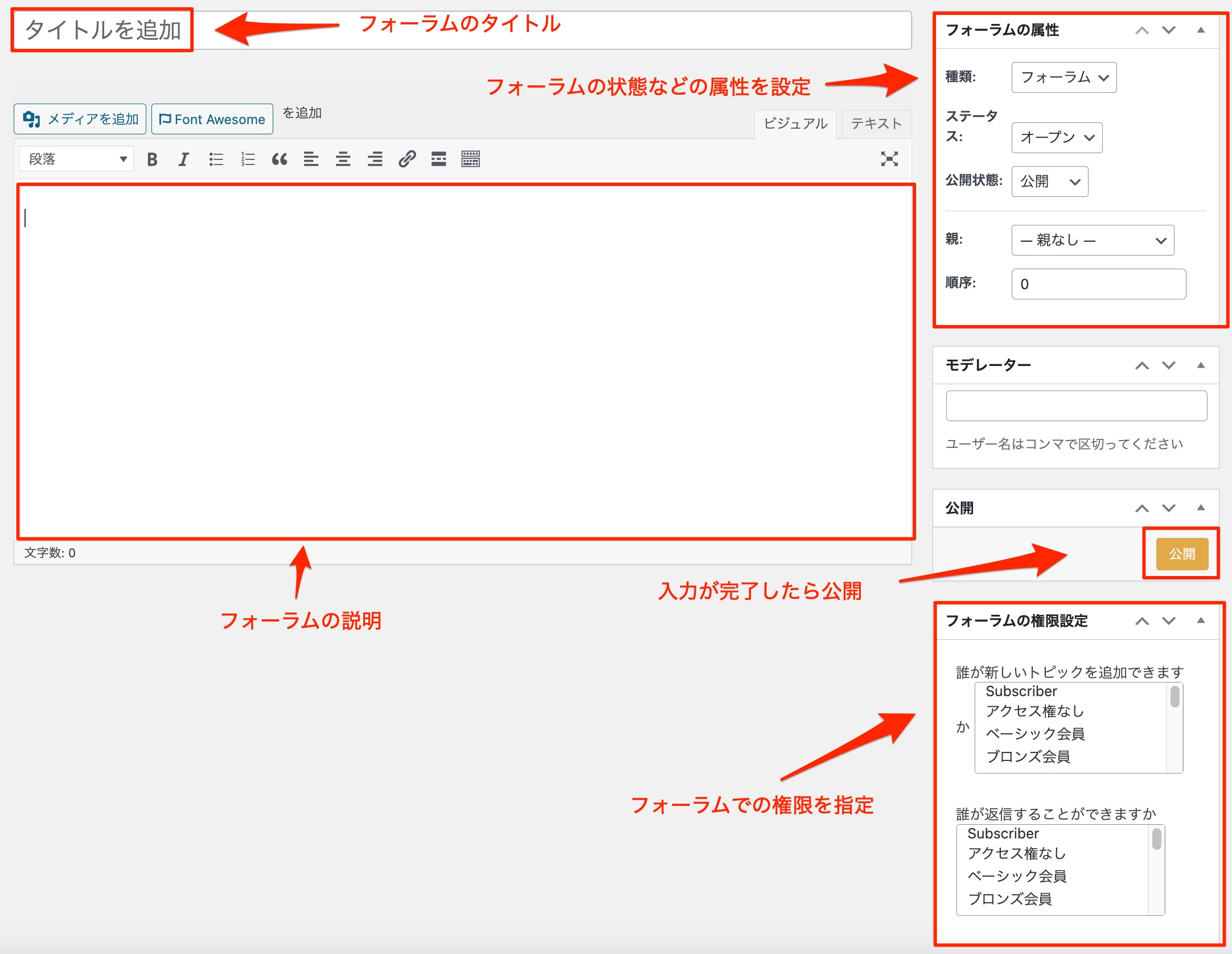 「経営者のフォーラム」「マーケティングのフォーラム」「雑談フォーラム」のように複数のフォーラムを設置することができます。
